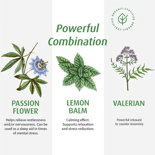 Powerful combination of Passion flower, Lemon balm and Valerian.