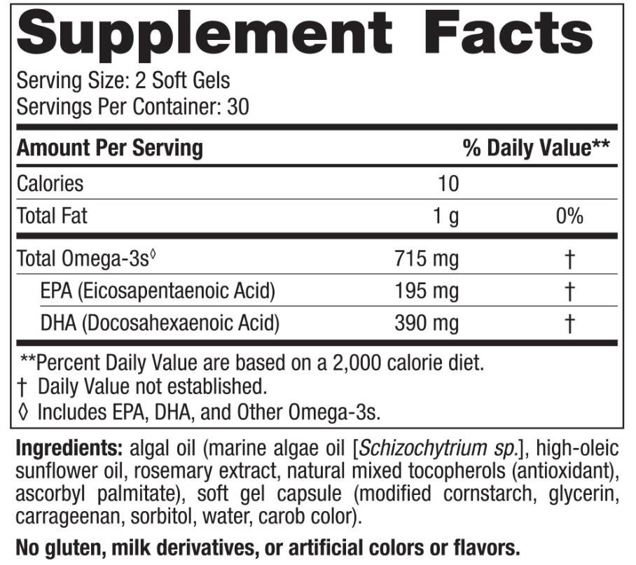 Algae Omega gives vegetarians and vegans a great way to meet their daily recommended serving of omega-3 EPA+DHA.
