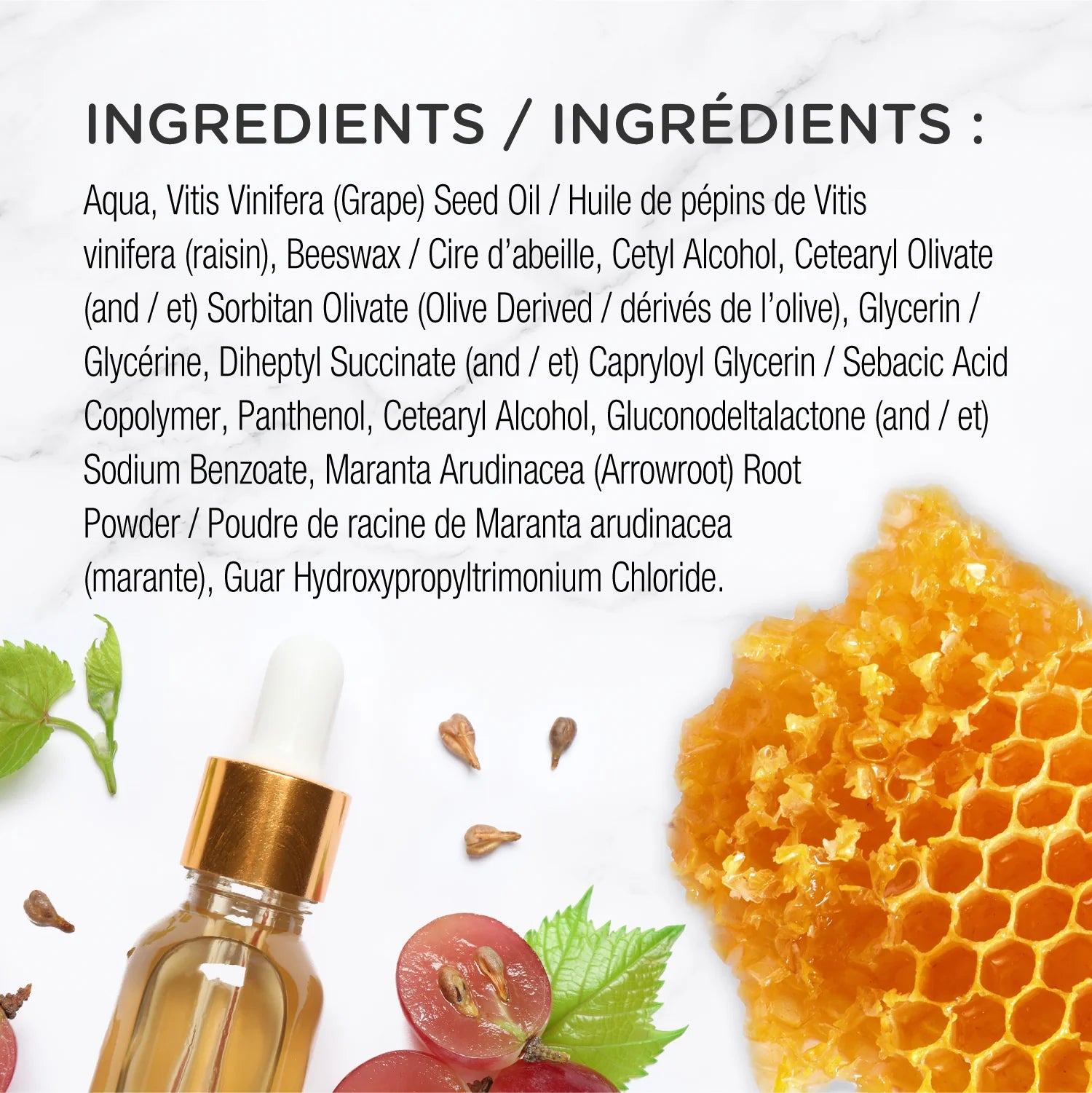 Aqua, Vitis Vinifera (Grape) Seed Oil / Huile de pépins de Vitis vinifera (raisin), Beeswax / Cire d'abeille, Cetyl Alcohol, Cetearyl Olivate (and / et) Sorbitan Olivate (Olive Derived / dérivés de l'olive), Glycerin / Glycérine, Diheptyl Succinate (and / et) Capryloyl Glycerin / Sebacic Acid Copolymer, Panthenol, Cetearyl Alcohol, Gluconodeltalactone (and / et) Sodium Benzoate, Maranta Arudinacea (Arrowroot) Root Powder / Poudre de racine de Maranta arudinacea (marante), Guar Hydroxypropyltrimonium Chloride.