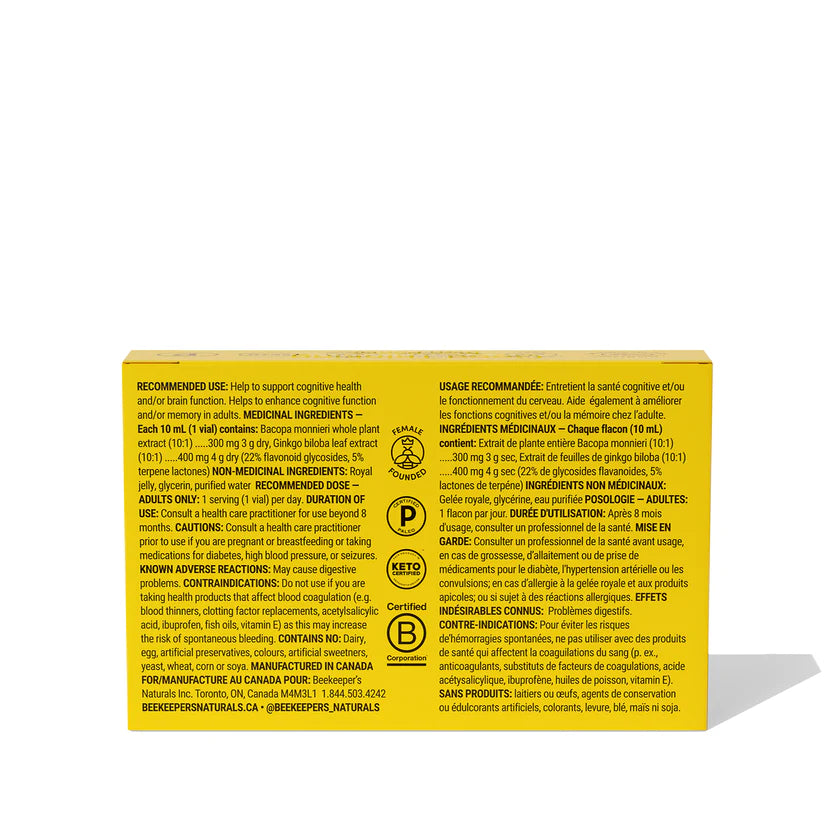 MEDICINAL INGREDIENTS Each 10 mL (1 vial) contains: Bacopa monnieri whole plant extract (10:1) ....300 mg 3 g dry, Ginkgo biloba leaf extract (10:1) ...400 mg 4 g dry (22% flavonoid glycosides, 5% terpene lactones) NON-MEDICINAL INGREDIENTS: Royal jelly, glycerin, purified water. Certified keto and paleo. Gluten-free and soy-free. Always free of artificial colors, preservatives, fillers, alcohol, GMOs, and refined sugars.