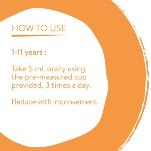 Children from 1 to 11 years:Take 5 mL orally, using the pre-measured cup provided, 3 times per day. Reduce with improvement.Do not administer to children weighing less than 8 kg (17 pounds).