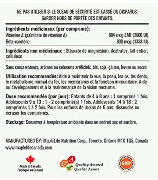 Containing a blend of vitamin A and beta-carotene, MapleLife Vision Chewables are deliciously milk flavoured, contain no sugar or gluten, and help to maintain eyesight and night vision. Health Canada registered NPN 80079698.