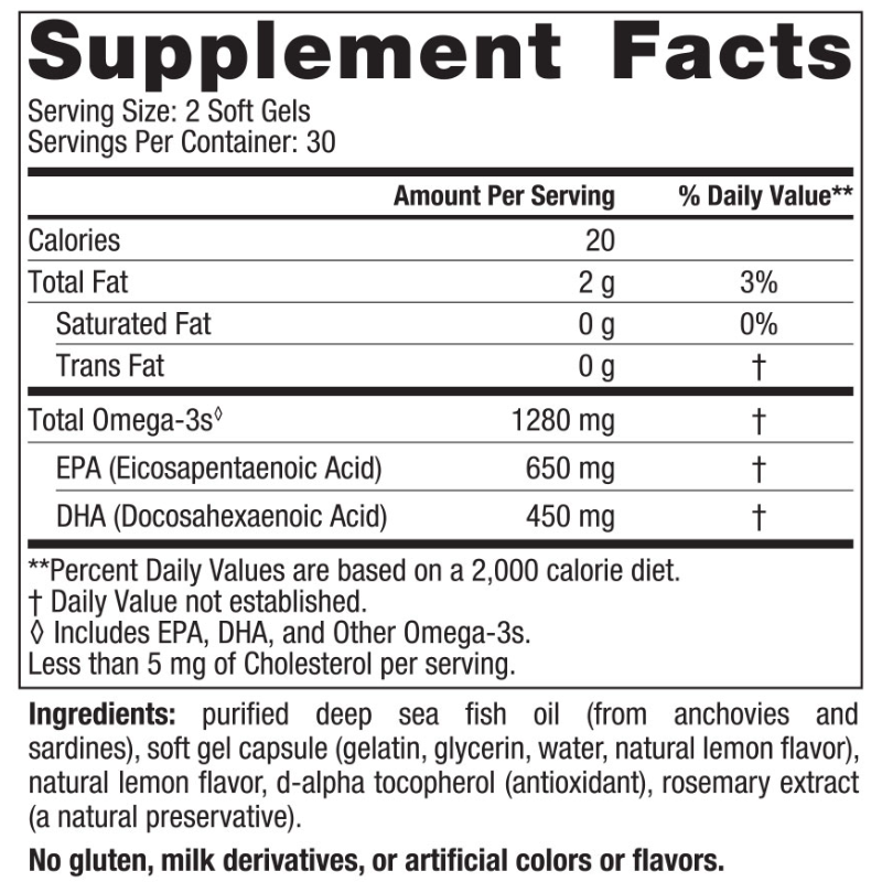 - 1280 mg total omega-3s (soft gels); 2840 mg total omega-3s (liquid)