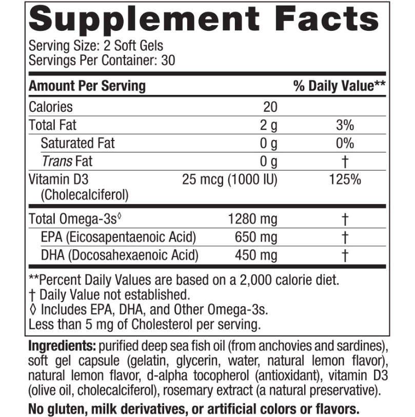 - 1280 mg total omega-3s; 1000 IU Vitamin D3