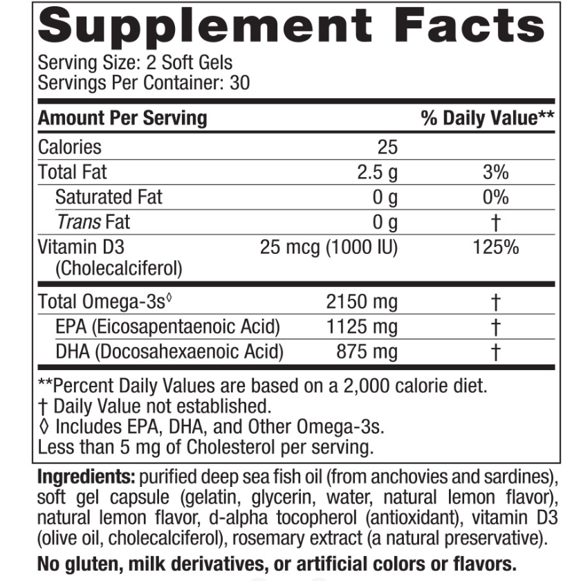 - 2150 mg total omega-3s; 1000 IU Vitamin D3