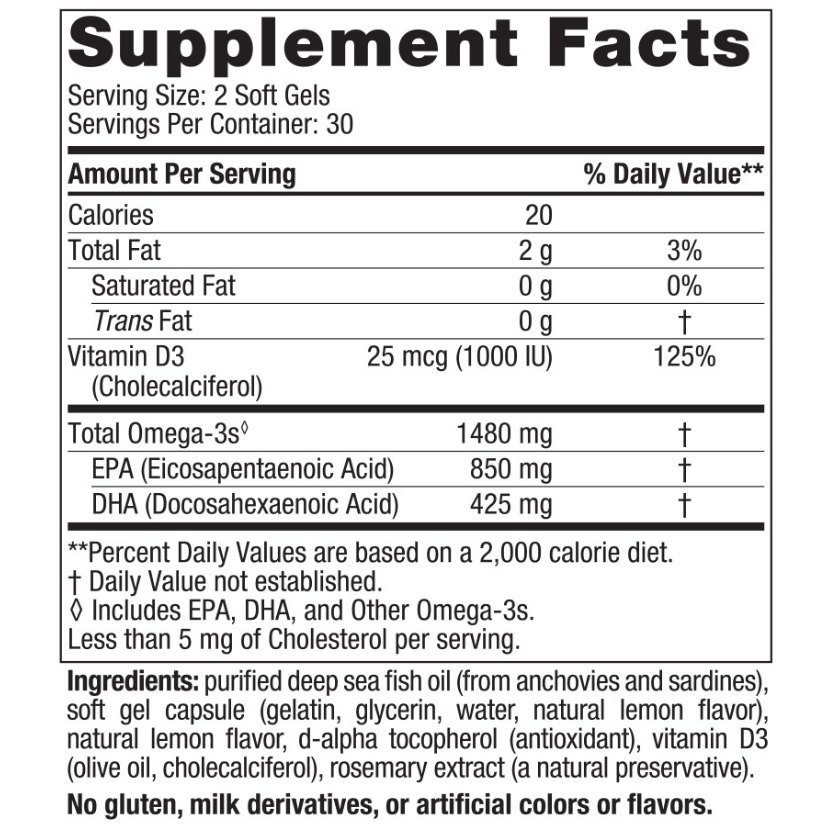 - 1480 mg total omega-3s (soft gels); 3400 mg total omega-3s (liquid); 1000 IU Vitamin D3