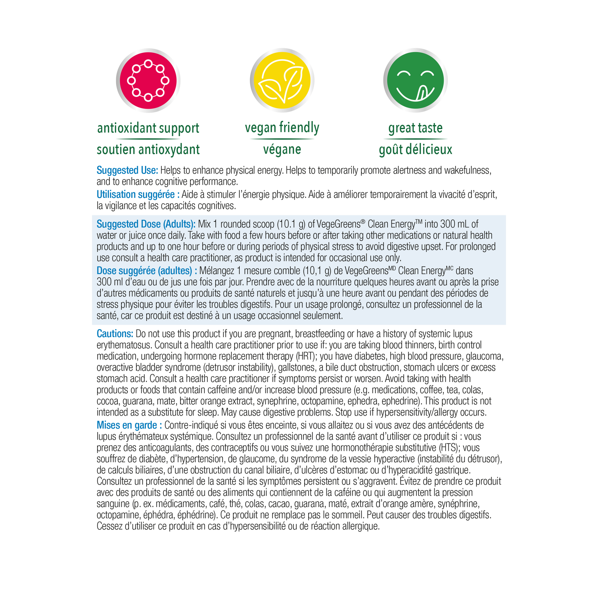Mix 1 rounded scoop (10.1 g) of VegeGreens® Clean EnergyTM into 300 mL of water or juice once daily. Take with food a few hours before or after taking other medications or natural health products and up to one hour before or during periods of physical stress to avoid digestive upset. For prolonged use consult a health care practitioner, as product is intended for occasional use only.