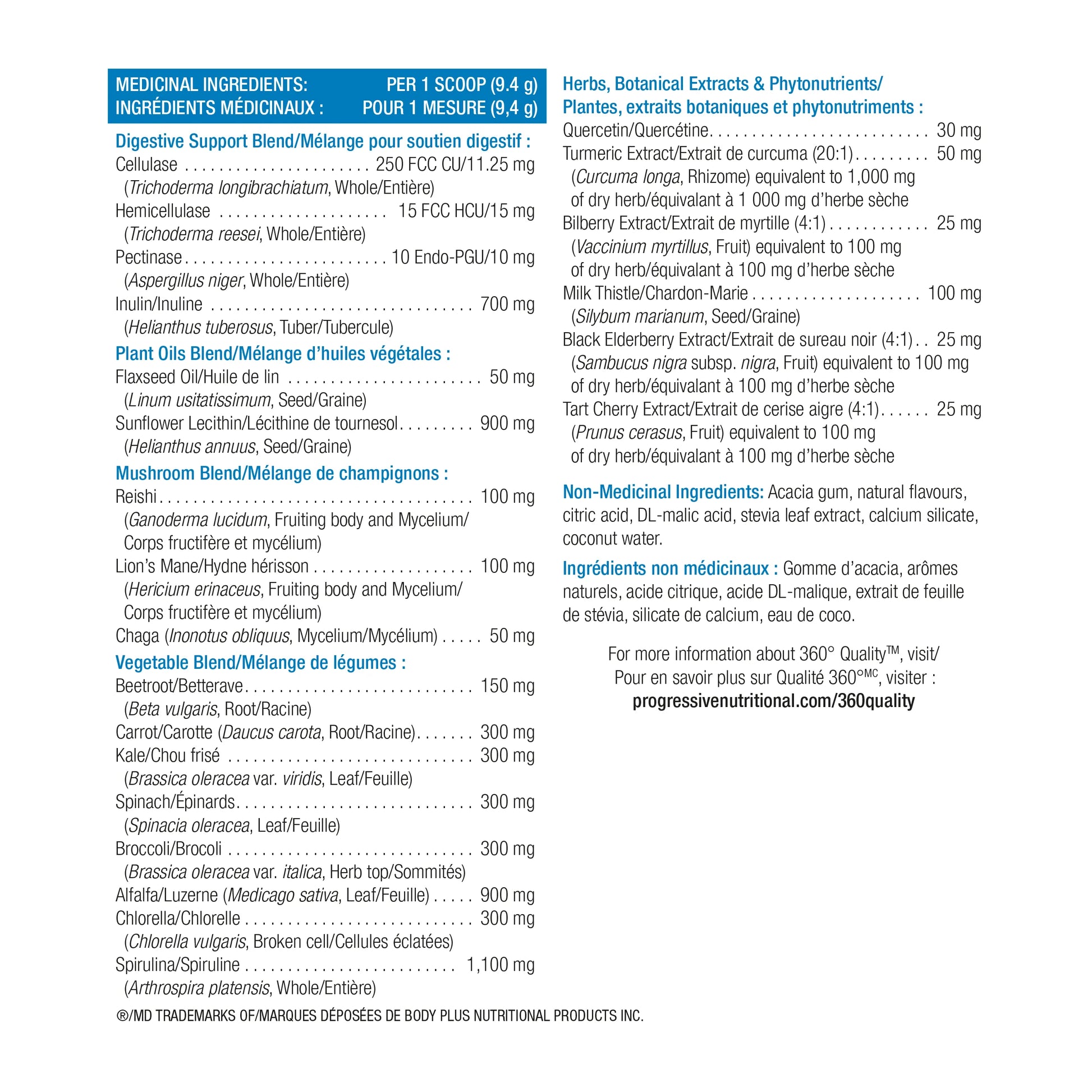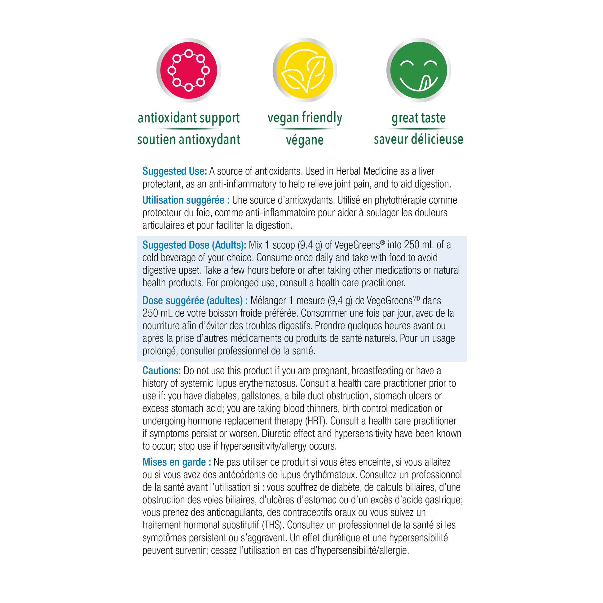 Mix 1 scoop (8.5 g) of VegeGreens® into 250 mL of a cold beverage of your choice. Consume once daily and take with food to avoid digestive upset. Take a few hours before or after taking other medications or natural health products. For prolonged use, consult a health care practitioner.